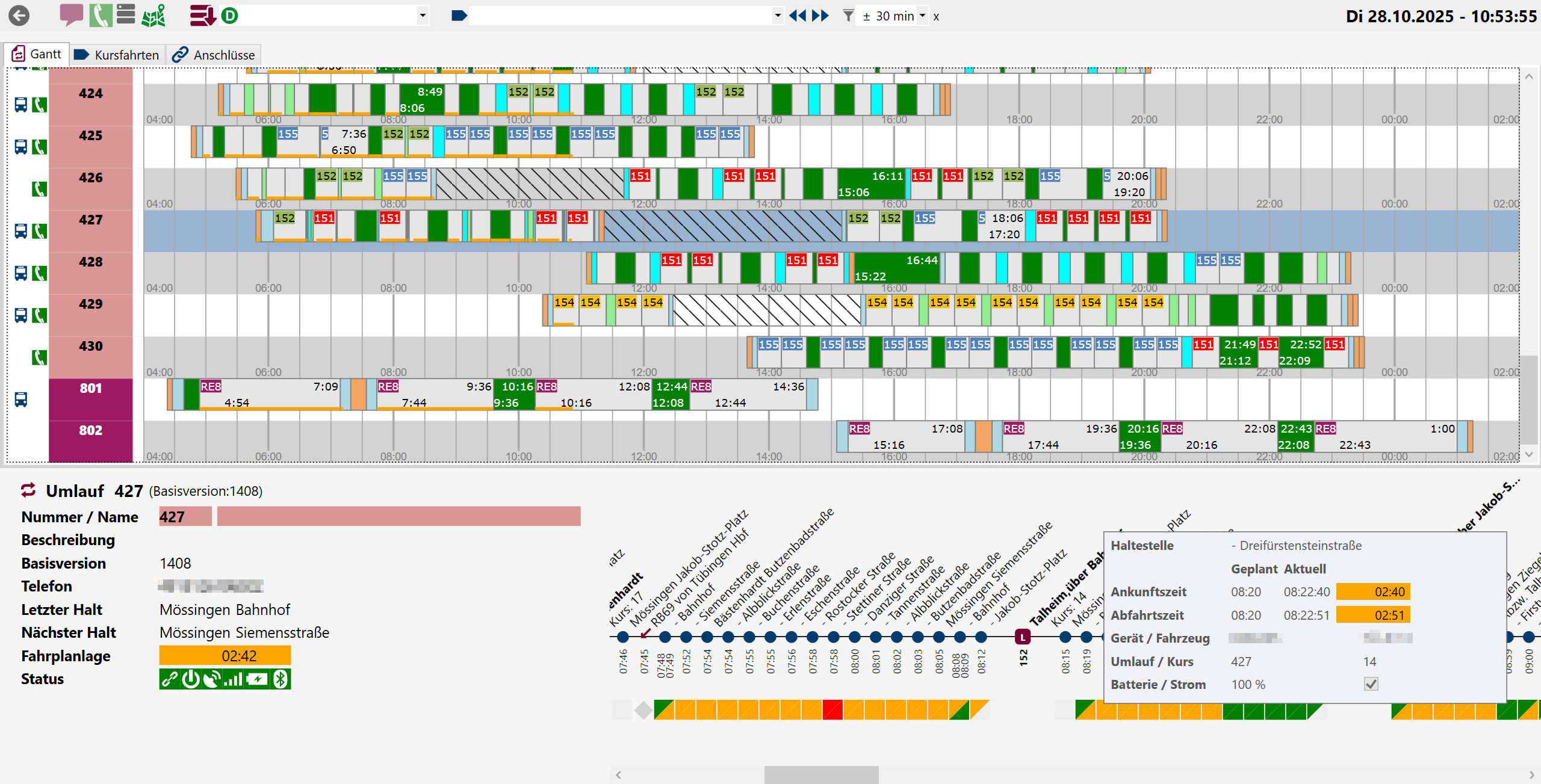 Die Geräte im Fahrzeug melden zyklisch ihre Position Fahrzeiten und Statusinfos an die Leitstelle. Alles wird mit Zeitstempel protokolliert und steht der Disposition in verschiedenen Ansichten zur Verfügung. Dispositionsentscheidungen wie Kursausfall Ersatzfahrt oder Sperrung einer Haltestelle sind per Mausklick wählbar. Anschlüsse können grafisch dargestellt und gespeichert werden. Abfahrtszeiten werden in der Fahrplanansicht so angezeigt dass Rückfragen schneller beantwortet werden können.