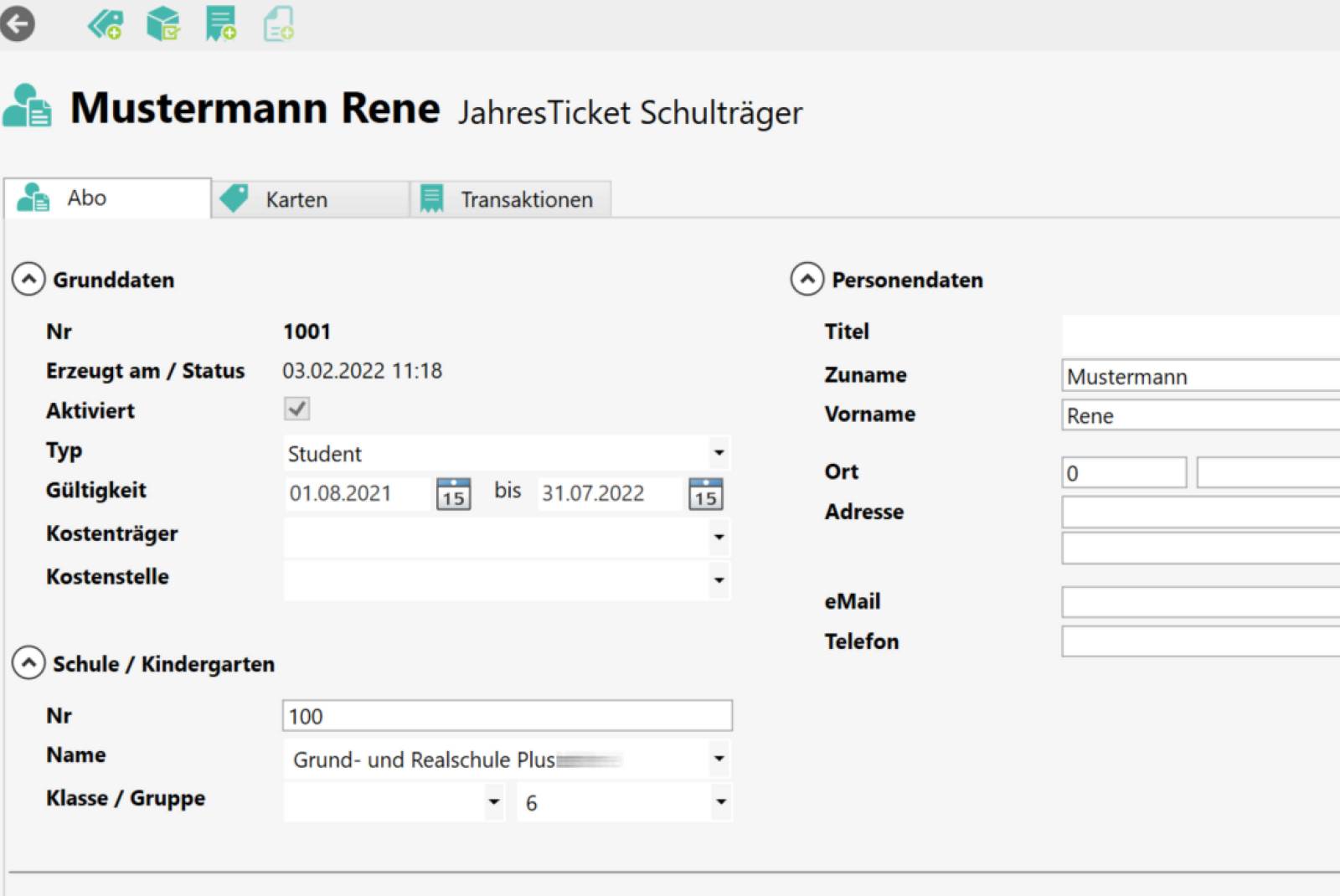 AboMATRIK ist ein modernes Abonnementsystem für die einfache Verwaltung der Schüler und Abonnenten. Über Excel-, CSV-, Text- oder XML-Dateien werden die Daten rasch eingelesen (auf Wunsch inkl. Bild). Die korrekten Preisstufen und Tarife werden über die implementierten Tarifdaten ermittelt. Verschiedene Tarife sowie Layouts werden im Hintergrundsystem gepflegt. Die Abrechnung erfolgt mit wenigen Klicks sauber getrennt nach Aufgabenträgern und aufgeschlüsselt bis zum Karteninhaber. Das Programm bietet darüber hinaus die Buchhaltungsfunktion mit SEPA-Abbuchung, Rechnungsstellung und Mahnwesen.