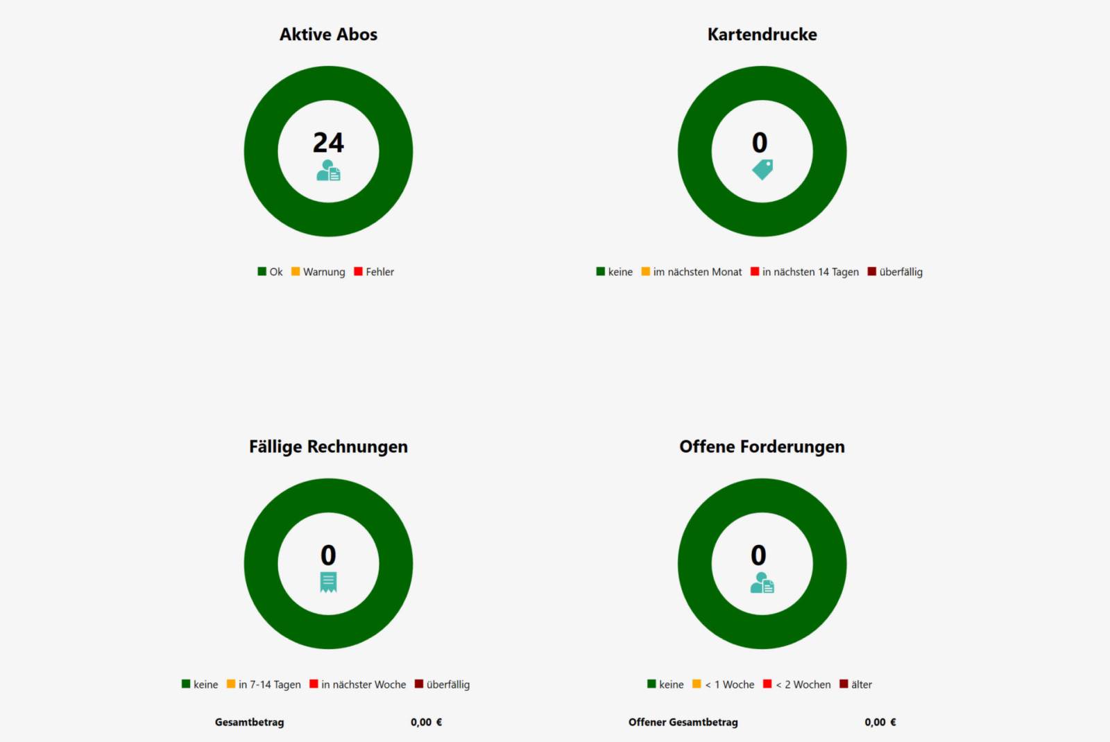 Alle korrekt angelegten und aktivierten Abos werden in einer zusätzlichen Ansicht grafisch dargestellt. Diese zeigt an, ob und wie viele Tickets in welchem Zeitraum gedruckt werden müssen oder sogar schon überfällig sind. Grundsätzlich können Abos einzeln direkt aus der Stammdatenmaske oder gesammelt gedruckt werden.