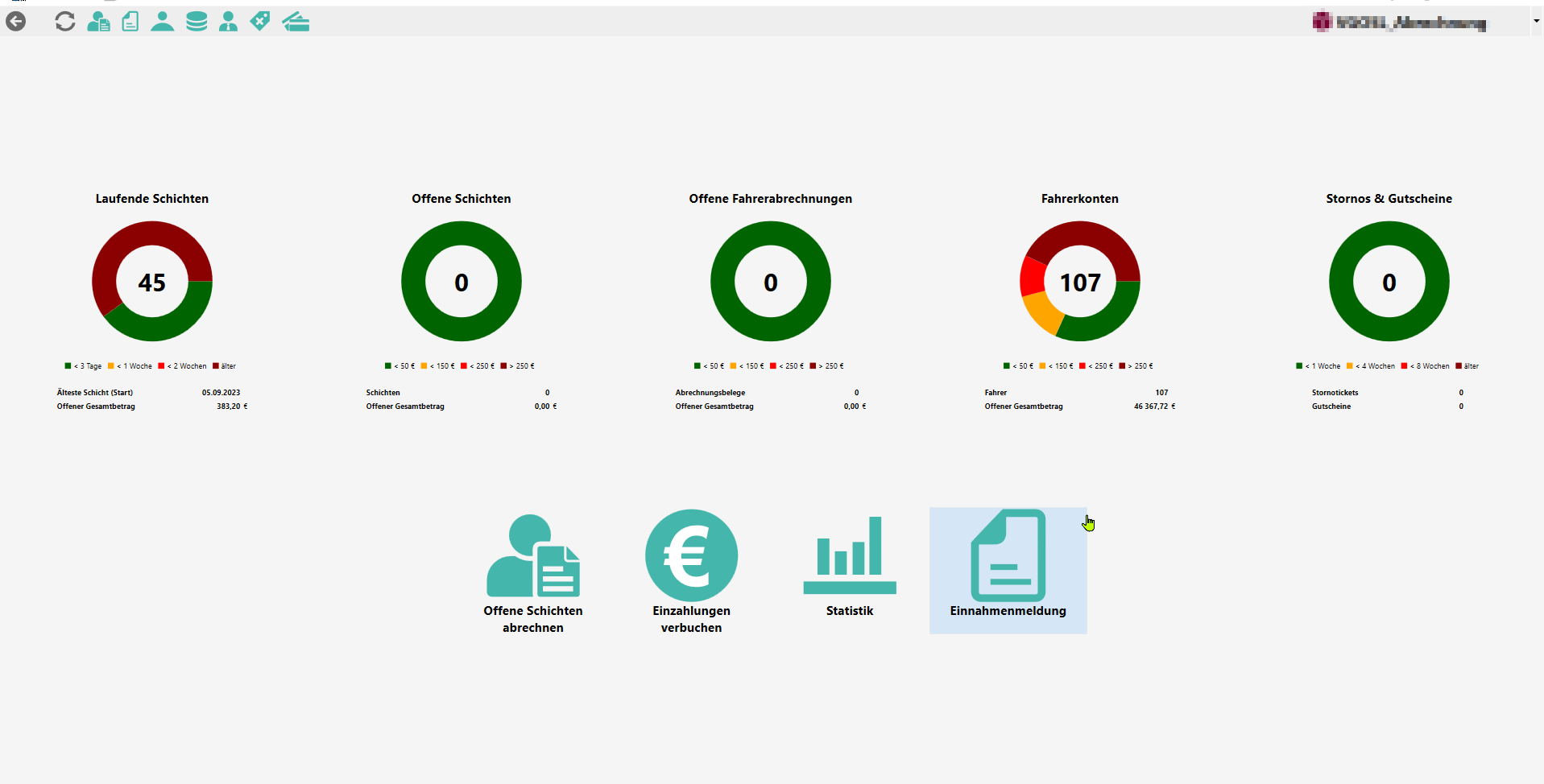 Du rechnest offene Schichten ab, verwaltest Einzahlungen und erzeugst Einnahmenmeldungen automatisch nach konfigurierten Filtern.
